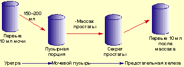 Ведущее место в лабораторной диагностике ХБП принадлежит микробиологическому исследованию — четырехстаканному локализационному тесту, предложенному в 1968 г. Meares и Stamey [8]. Он состоит в получении, после тщательного туалета наружных половых органов (во избежание контаминации поверхностными бактериями), первой (10 мл) и второй (средней) порций мочи для бактериологического исследования, массажа предстательной железы (ПЖ) со взятием секрета для микроскопии и посева, а также третьей порции мочи (после взятия секрета) для посева (рис. 1). Количественные посевы первой и второй порций мочи выявляют бактерии в уретре и мочевом пузыре, в то время как при посевах секрета простаты и порции мочи после взятия секрета (третьей порции мочи) выявляют флору простаты. ХБП характеризуется воспалительной реакцией в секрете (при микроскопии определяется более 10 лейкоцитов в поле зрения при большом увеличении). После инкубации посевов подсчитывают количество колониеобразующих единиц (КОЕ).