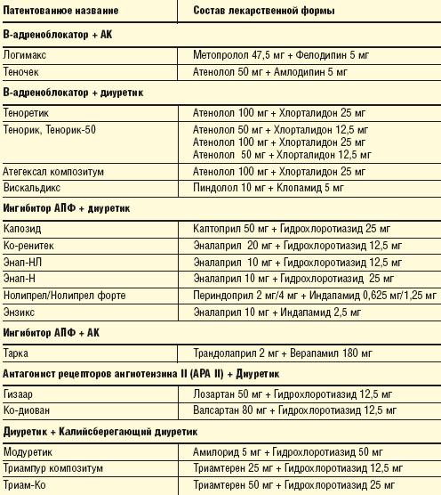 | Современные препараты, содержащие фиксированные комбинации антигипертензивных лекарственных средств (зарегистрированы в РФ) |
