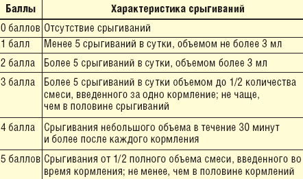 Согласно современным представлениям, интенсивность срыгиваний оценивают по пятибалльной шкале, отражающей частоту и объем срыгиваний (табл. 1).