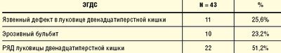 Продолжительность «язвенного» анамнеза у обследованных больных колебалась от 5 до 15 лет. ЯБДПК по данным эндоскопического исследования была в стадии обострения у 21 больного, причем «язвенный» дефект в луковице двенадцатиперстной кишки выявлялся у 11 пациентов, а у 10 — эрозивный бульбит. У 22 обследованных больных ЯБДПК была в стадии ремиссии, по данным эзофагогастродуоденоскопии (ЭГДС) выявлялась рубцово-язвенная деформация (РЯД) луковицы двенадцатиперстной кишки (табл. 1).